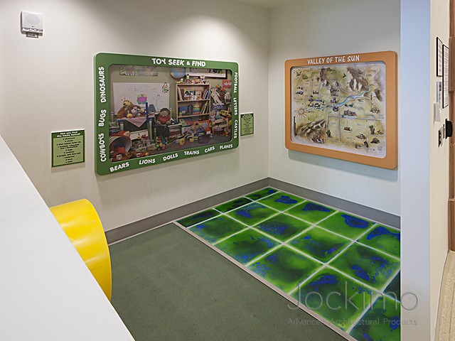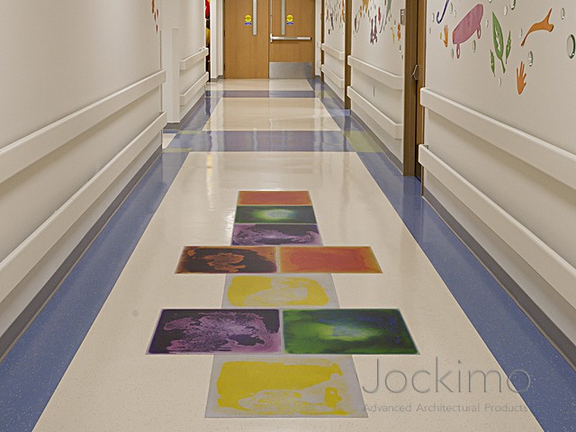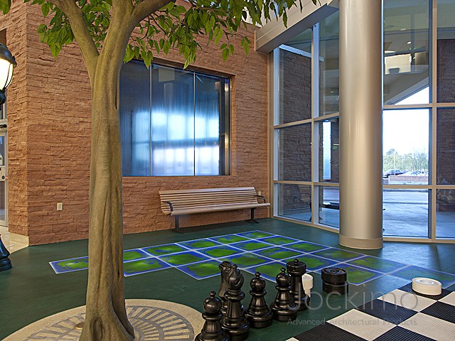 Our Liquid Lava™ floor tiles are utilized in this children's hospital in AZ. Our tiles are found at the entrance, the waiting/play room, and a hopscotch court. Children love to interact and play with the Liquid Lava™ tiles.