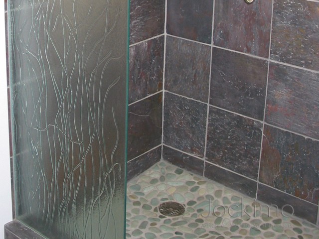 Our Sea Grass texture was cast into this shower panel. The free-form design goes perfectly with the real stone floor in the shower. The glass is 3/8" Clear tempered. There was also a bathroom window produced on this project to match the texture in the shower panel.