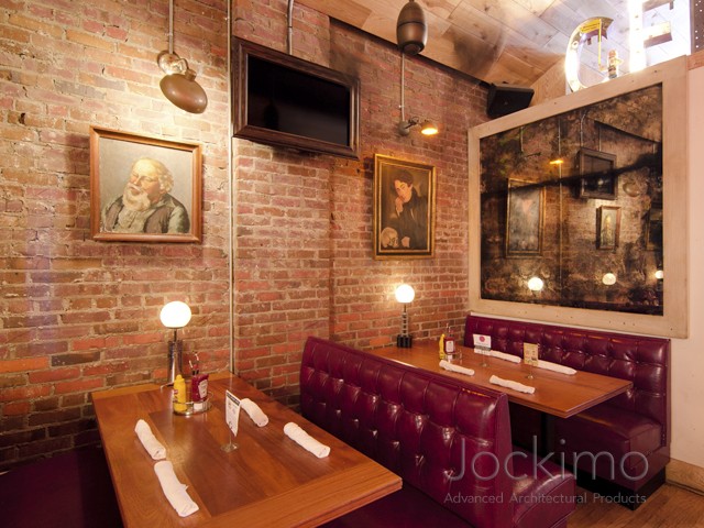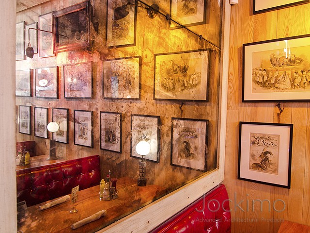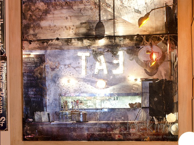 Glass: Jockimo Heavily distressed butted framed panels with hand cast lead rosettes.