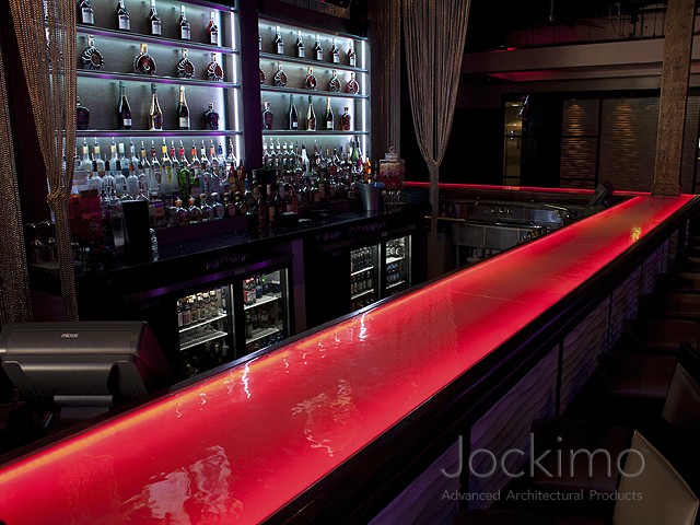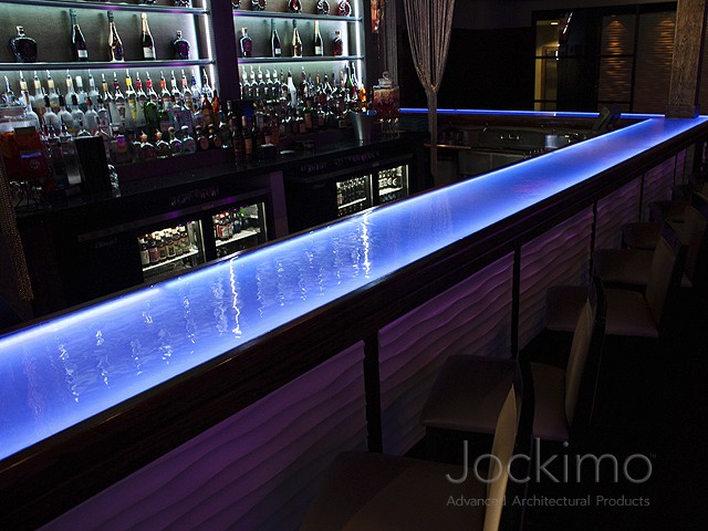 Our Small Rocks texture is utilized as a bar top in this bar. We sand blasted the back of our glass to act as a diffuser to the lights under the glass. All glass was cut to provided templates.