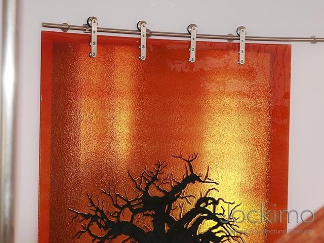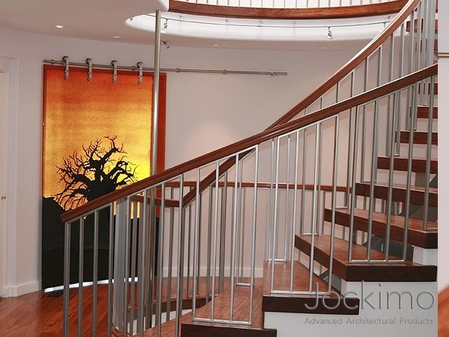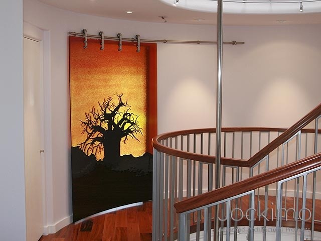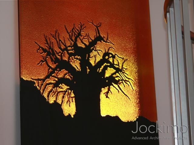 Our customer fell in love with the baobob tree while on a trip to Africa and they asked us to create a custom door for their master bedroom. Jockimo designed the panel which includes a custom cast baobob tree design. We bent and tempered the glass and then hand painted the entire back of the panel to create the sunset behind the tree. Holes were drilled on the top of the panel to accommodate the barn door style hardware.