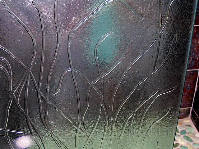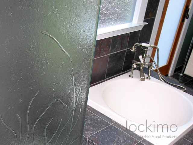 Our Sea Grass texture was cast into this shower panel. The free-form design goes perfectly with the real stone floor in the shower. The glass is 3/8" Clear tempered.