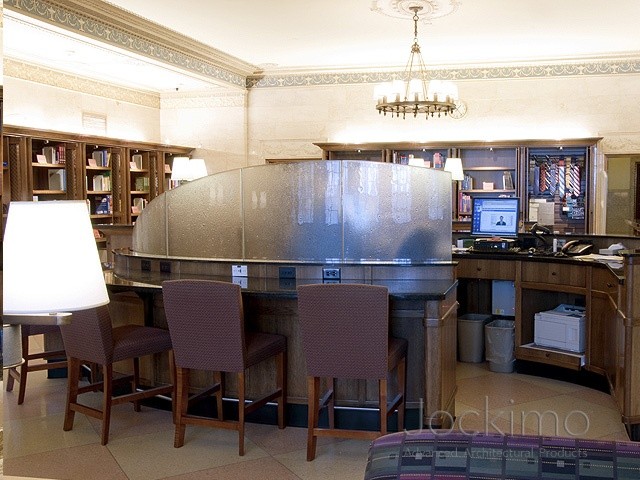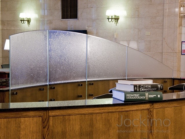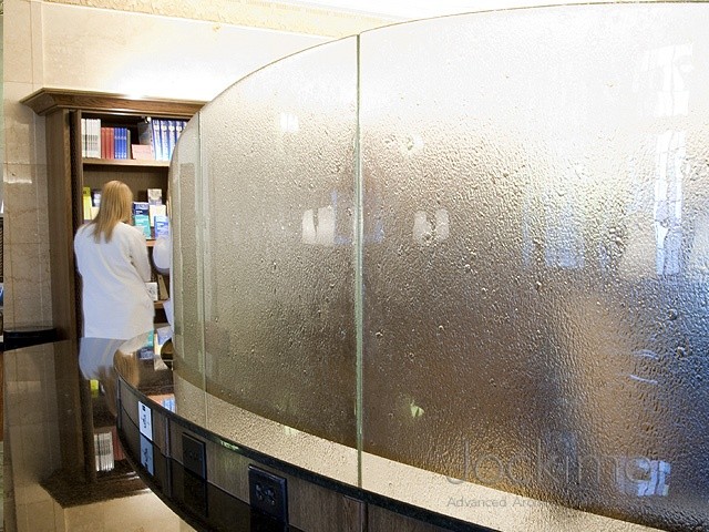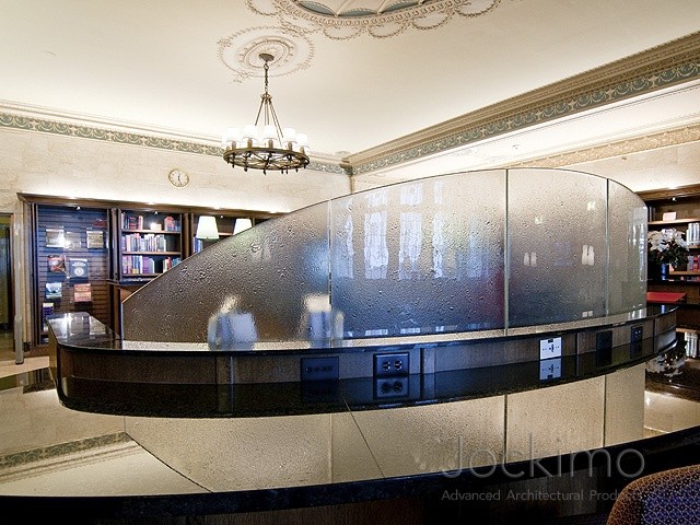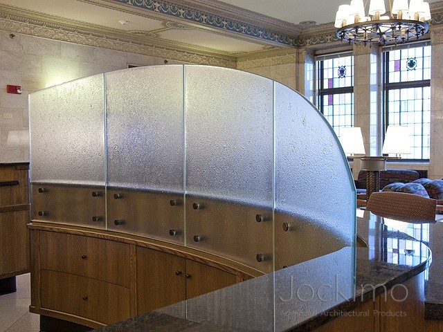 Jockimo's Revo texture was specified and utilized on these interior divider panels at the Mayo Clinic in MN. All glass is bent and tempered to fit the radius of the desk.
