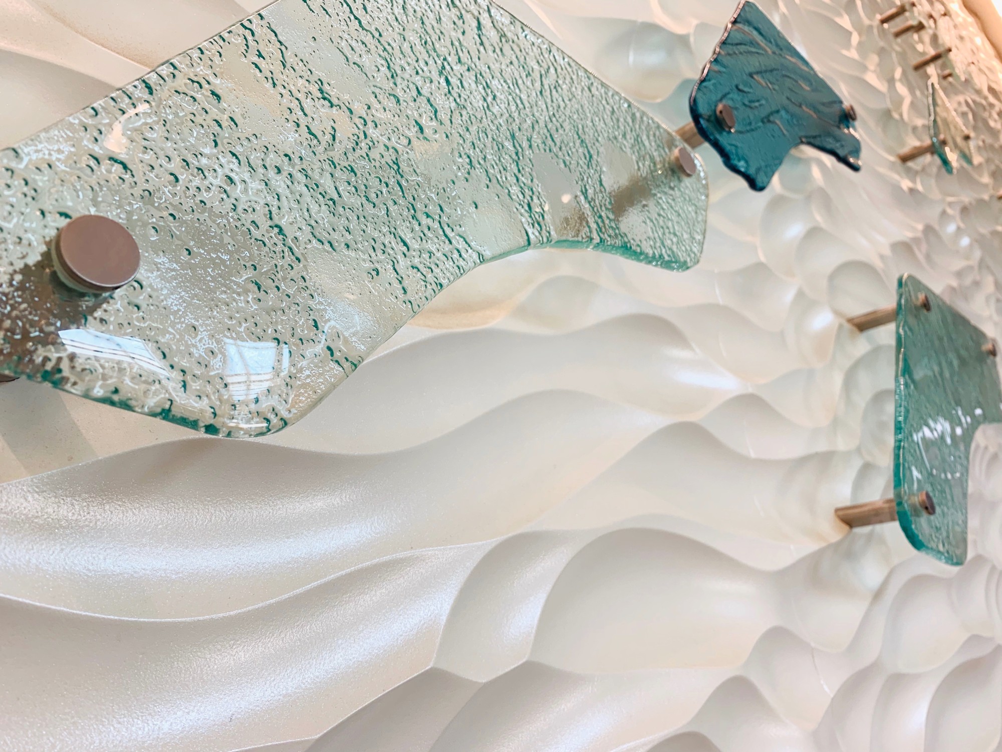 Jockimo provided the glass "fish" for the feature wall in this brand new hotel in SC. Jockimo provided the glass "fish" for the feature wall in this brand new hotel in SC. The project inclides 3 different textures, 3 different glass colors and 3 different sizes of "fish".