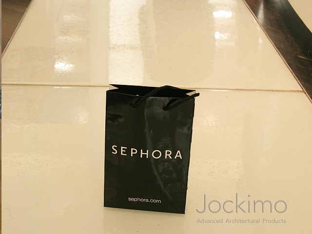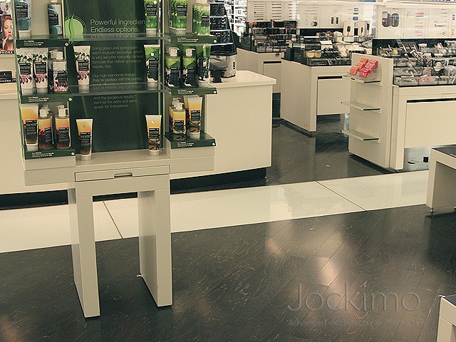 The designers required a white glass flooring product to run the width of their new Cerritos store. We provided our GlassGglass in 1/2" thick tempered and we back painted the glass an opaque white color. The glass is installed on top of a white layer of 1/8" thick neoprene which absorbs shock.